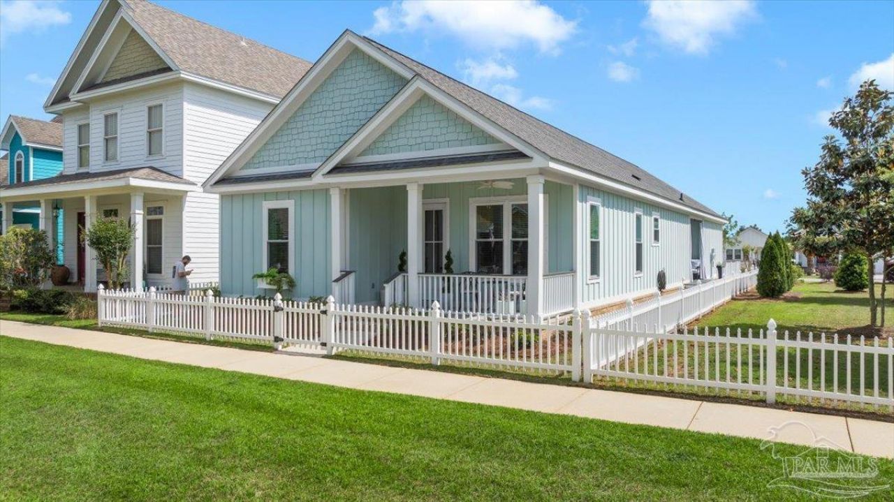 Experience refined coastal living in this impeccably maintained, Gold Fortified residence located within the gated community of Cottages on the Green. Built in 2022, this 3-bedroom, 2-bath home offers 1894sf of thoughtfully designed space, blending quality construction with elevated design. From the moment you enter, you'll notice the attention to detail with extra-tall doors, crown molding, fully encased windows and doors, and upgraded designer lighting throughout. The chef's kitchen is both sophisticated and functional, featuring granite countertops, a composite sink, gas range, tankless water heater, and an oversized island with seating, making this an ideal area for entertaining. Blinds and window coverings are already in place, offering immediate comfort and privacy. The dining area features a coffered ceiling and statement chandelier, adding an elegant touch for formal gatherings. The primary suite serves as a private retreat, complete with a spa-inspired bath with a beautifully tiled shower, double vanity, expansive walk-in closet, and a dedicated makeup vanity. A generously sized laundry room with built-in shelving adds everyday convenience, with washer and dryer included. Outdoor living is equally inviting, with a charming front porch overlooking a manicured green space and a covered rear deck designed for year-round enjoyment. Complete with patio furnishings and soft drapery, this space offers both comfort and shade from the Alabama sun. The fenced yard showcases newly installed sod and landscaping for a polished finish. Additional features include a sprinkler system, fabric hurricane shutters, and a spacious two-car garage. A $5,000 flooring allowance is offered, allowing buyers to tailor finishes to their personal style. Select furnishings may be negotiated. Residents of this community enjoy access to resort-style amenities - pool, clubhouse with library, & fitness room-all just minutes from the Gulf! Buyer to verify all info during due diligence.