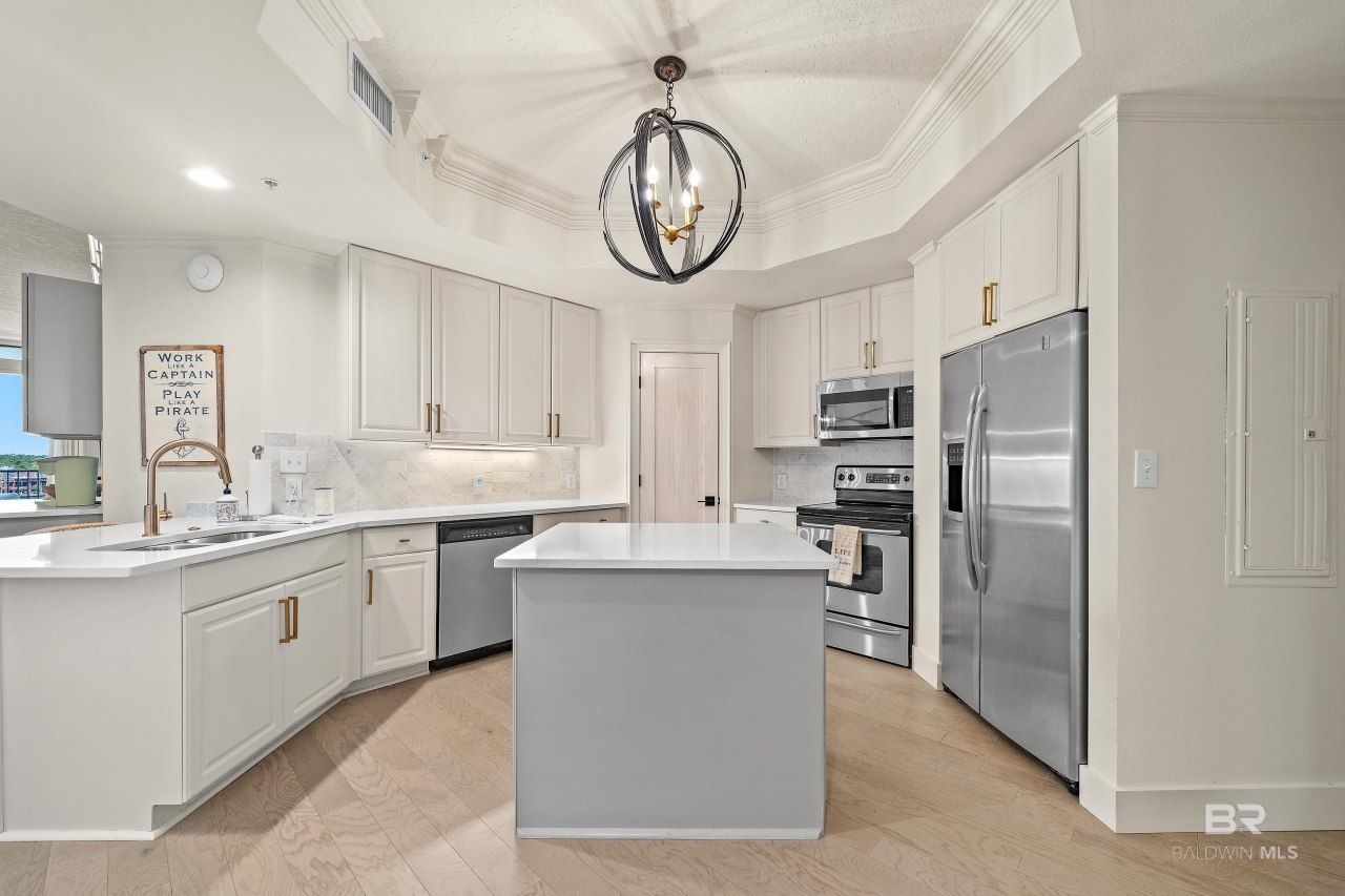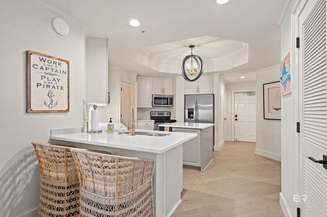 This 3-bedroom, 2-bath condo features comes with assigned parking space #A503, Boat slip #B47 with 20,000-pound lift. The bright kitchen is equipped with a center island, updated stainless steel appliances, white oak floating shelves, gorgeous quartz countertops and a wet bar with ice maker. With white oak hardwood floors throughout, all 3 bedrooms are spacious with plenty of closet space for guests. Master bathroom has a large tile shower with his and her vanities. All new paint, light fixtures, plumbing fixtures, trim/ door hardware and fans have been upgraded. This low-density complex offers an indoor pool, with easy access to the outdoor pool and spacious lounging decks on both levels right on Cotton Bayou's shore. Additional amenities include a hot tub, exercise room, sauna, and steam room. Each unit comes with a secured indoor storage closet for coolers, fishing gear, and beach toys. Located in the building's prime protected center, this condo boasts an oversized, private, and shady balcony with sweeping views of Cotton Bayou, as well as Gilchrist, Bird, and Robinson Islands. Enjoy the view as boats cruise between marinas, islands, and Perdido Pass on their way to the Gulf of Mexico. Owners love to gather at the fishing docks, BBQ area, and multiple social zones with stunning Gulf views on the south-facing patios. Unit to be sold completely furnished except for a few items. Complex is rent restricted. Buyer to verify all information during due diligence.